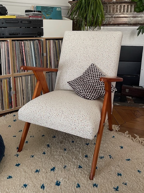 Ce beau fauteuil années 50 est de retour dans son appartement parisien.